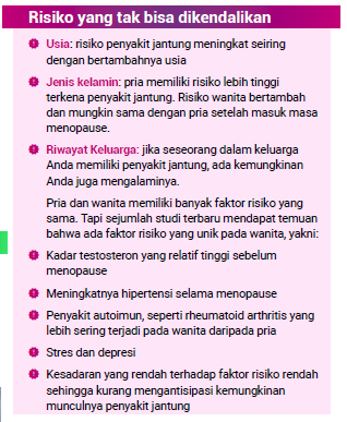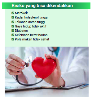 Sebagian besar masyarakat memiliki setidaknya satu faktor risiko penyakit jantung. Makin banyak faktor risiko, makin besar kemungkinan menderita penyakit tersebut. Terdapat dua macam faktor risiko penyakit jantung, yakni yang bisa dikendalikan dan tak bisa dikendalikan.