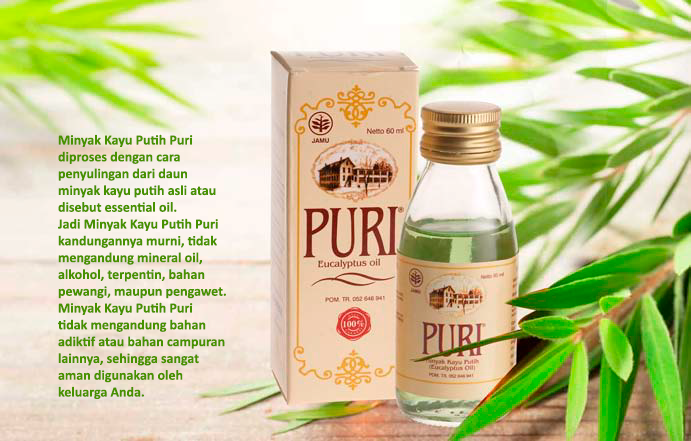 Selain itu kandungan minyak esensial eucalyptus di dalam Minyak Kayu Putih Puri digunakan untuk membantu meringankan keluhan pada dada, bronchitis, radang tenggorokan, sinusitis, migren, dan otot kaku. Minyak Kayu Putih Puri dapat berfungsi sebagai antiseptik, antiperadangan, analgesik, antiviral (membersihkan dan menyegarkan udara), balsamik (menyejukkan), dekongestan (mengurangi dan meringankan flu), ekspektoran, antibakterial, diuretik (meningkatkan pengeluaran urin), dan antirematik.